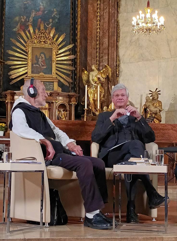 Da sitzt ein fast 99 Jahre alter, zarter, gebrechlicher Körper, aus dem kraftvoll und behutsam ewiger Geist spricht. Wenn er darum gebeten wird. Lieber schweigt er. Und hört zu ... dem Leben, in dem sich – für ihn – alles Göttliche zeigt. Still. Unaufdringlich. Um seine Zeitgenossen zu hören, braucht er mittlerweile «doppelte Kopfhörer» ... Für das Wesentliche braucht er keine Hörgeräte. David Steindl-Rast verdeutlicht den Unterschied zwischen Religiosität – «wahrhaft Gott zu suchen, wie Mönche es tun (wollen)» – und Religion(en) – «Versuche von Religionsstiftern, je nach Kultur, den Menschen Religiosität näher zu bringen».Das Christentum sei in diesem Sinn «nicht bevorzugt gegenüber anderen Religionen». Und noch deutlicher: «Für Religiosität braucht es keine Kirche!» Gesprächspartner in der berstend vollen Kirche St. Josef in Wien-Margarethen ist Pfarrer Matthias Beck, der betont: «Wir sind Christen, nicht Kirchisten! Gott redet mit uns in der Weise des Schweigens ...»