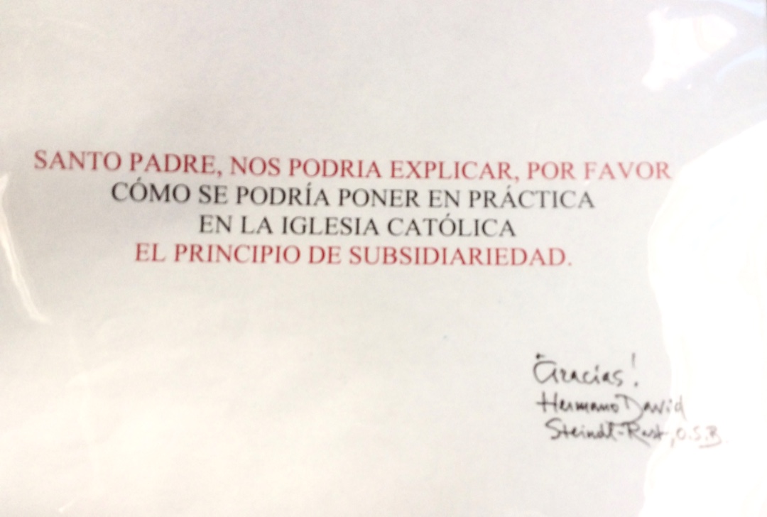 Ich habe also in kürzester Form – in nur vier Zeilen auf Spanisch – mein Anliegen aufgeschrieben: die Bitte an Papst Franziskus, darüber zu sprechen, wie das Subsidiaritätsprinzip praktisch in der Kirche angewendet werden könnte.