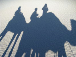 das sind nicht die Heiligen Drei Könige auf ihren Kamelen – obwohl das gut zu einem Weihnachtsbrief passen würde – sondern es ist eines meiner Photos aus der Sahara. Dort durfte ich kürzlich eine Woche der Einkehr verbringen zusammen mit sieben Beduinen (beeindruckenden Männern aus der Generation, die noch in der Wüste aufwuchs), siebzehn Kamelen (darunter ein weißes), und einer ganz auserlesenen Gruppe von fűnfundzwanzig Menschen. In der unermesslichen Weite und Stille der Sanddühnen bei Tag und unter dem hochgewölbten Sternenhimmel bei Nacht setzten wir uns jener großen Gegenwart aus, zu der einst ein Stern den Königen den Weg wies.